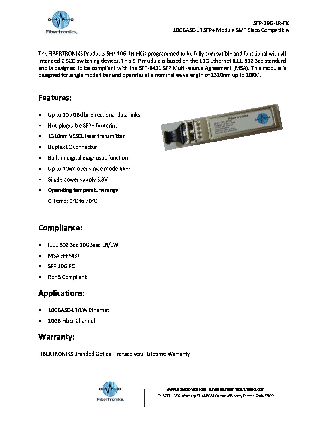 Ficha técnica ing-esp SFP-10G-LR-FK Spec Sheet